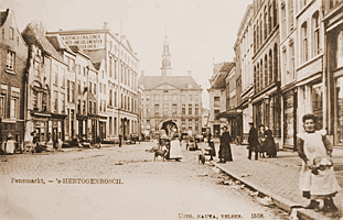 In het zogeheten 'Blok' op de Markt stond, tegenover de ingang van de Minderbroedersstraat, vanaf de late 13e eeuw de Lakenhal, ook wel Gewandhuis genoemd. Hier vond gecentraliseerd de lakenhandel plaats. In de vroege 15e eeuw ging het gebouw dienst doen als Vleeshuis, het behoorde toe aan het slagersgilde. De slacht van dieren en de verkoop van vlees waren aan strenge voorschriften gebonden. Vlees mocht alleen in het Vleeshuis verkocht worden, en nergens anders, iedere slager had er zijn eigen vleesbank. Op deze regel was één uitzondering: pens (koeienmaag) werd op straat vóór het Vleeshuis, buiten, in kramen verkocht door de zogenaamde 'pensvrouwen'. Het woord 'pens' heeft in dit geval ook betrekking op de ingewanden van een geslacht dier en ander slachtafval, en ook op bepaalde soorten orgaanvlees, poten en koppen. Als je eraan kwam lopen richting de Vleeshal, kwam je eerst de pensvrouwen met hun 'mindere' vleeswaren tegen. Wellicht is dit er de oorzaak van dat dit deel van de Markt niet Vleesmarkt is gaan heten, maar Pensmarkt. Die naam kom je volgens Marcel van der Heijden niet veel tegen. Voor zover hij heeft kunnen nagaan is er in Nederland geen tweede, in Vlaanderen heeft in ieder geval Gent er een. Het Vleeshuis werd in 1860 afgebroken. Daarvoor in de plaats kwam de Boterhal, het Provinciaal Genootschap (voorloper van het Noordbrabants Museum) betrok de bovenverdieping. In de parterre was de Stadswaag gevestigd. Rond 1932 kocht kledingfirma C&A de Boterhal aan en verbouwde die tot een modern warenhuis. |