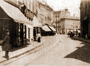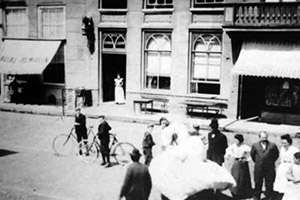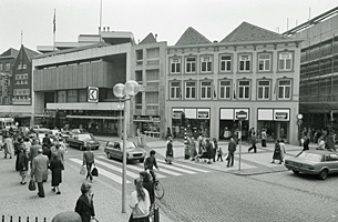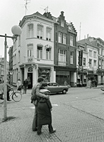 ![]() Geen wonder: rond de eeuwwisseling was een auto nog een rariteit waarvan er slechts enkele in ons land reden. En het verkeer tussen steden onderling vond meestal per boot plaats. Een rustige zomermiddag op de Schapenmarkt. Aan de noord-west zijde van de Schapenmarkt hebben de winkels grote luifels. In een tijd waarin koelvitrines nog niet bestonden werden deze luifels zo spoedig mogelijk omlaag gehangen om binnendringende zonnestralen te weren. Tussen de winkels bevinden zich nog particuliere woonhuizen. Aan de overzijde van de straat tref je geen luifels aan. Daar is dat niet nodig: die zijde bevindt zich continu in de schaduw. Hier bevinden zich minder winkels, maar ondermeer is er nog het kantoor van Gemeentewerken te zien dat hier in het begin van de eeuw gesitueerd was. In de verte zien we op de oude foto de Boterhal en een ernaast gelegen kleiner, maar toch fors bouwwerk op de Markt. Zij bepaalden toen - evenals het winkelpand thans - het stadsbeeld. In de straat bevinden zich rails. Hierover reed vanaf november 1881 de stoomtram. Vanaf 1895 werd deze tram getrokken door paarden. Is hier sprake van een omgekeerde vooruitgang: normaal zou men zeggen: eerst een paardentractie en daarna een machine! De paardentram verdween in 1929. Bijna een halve eeuw heeft er dus door de Schapenmarkt een tram gereden. Opmerkelijk is wel, dat op veel ansichtkaarten en foto's wel rails te zien zijn, maar dat de fotograaf kennelijk niet wilde wachten tot zo'n voertuig daadwerkelijk in beeld kwam. Wilde hij laten zien hoe 'bij de tijd”s-Hertogenbosch was? Verstoorde een tram volgens hem het stadsbeeld? In ieder geval is het wel zo dat thans bij verzamelaars van historische kaarten een dergelijk stadsbeeld mét tram een hogere waarde bezit dan wanneer deze niet aanwezig is. Geen tram in de Schapenmarkt, maar ook weinig volk op straat. We zien een enkele dienstbode lopen en een politieagent houdt toezicht. Veel heeft hij kennelijk niet te doen. Dan heeft de huidige politie het moeilijker. Nu in verband met werkzaamheden rond de Stoa en Arena het doorgaande verkeer de Schapenmarkt niet kan passeren, moeten zij automobilisten steeds opnieuw duidelijk maken dat er echt geen doorgang mogelijk is. Want er wordt druk gebouwd in de binnenstad. En het stadsbeeld verandert steeds weer. |