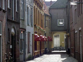 De Hinthamerstraat is een van de oudste in- en uitvalswegen van de stad ’s-Hertogenbosch. Al vrij vroeg, mogelijk reeds in de dertiende eeuw, ontstonden de eerste zijwegen aan deze hoofduitvalsweg. De zijstraten aan de noordkant van de Hinthamerstraat waren in de middeleeuwen de toegangswegen naar grote, stenen huizen en hun bijgebouwen. Deze zogeheten mansio’s stonden vooral aan de overzijde van de Binnendieze, die hier toen nog niet gedempt was. Bij deze mansio’s hoorden grote terreinen, die overgingen in tuinen, bleekvelden, grasvelden, stallen, boomgaarden en akkers. Lange tijd was het grootste deel van het gebied tussen de stadsmuur en de Dieze hiermee opgevuld. De Schilderstraat gezien in de richting van de Hinthamerstraat. Links de voormalige, gerestaureerde bordelen. Anno april 2010. Foto: Josephine Peren.Markante gebouwenEen markant gebouw in de Schilderstraat is Huize St. Agnes, dat vanaf 1855 onderdak bood aan arme vrouwen en meisjes en aan jongens tot zeven jaar. In 1907 werden de oude, arme vrouwen overgebracht naar het H. Geesthuis aan de Hinthamerstraat; het kreeg toen de naam St. Annagesticht. Het is nu de Openbare Bibliotheek.Omstreeks 1835 werd in de Schilderstraat door ene Mivion, afkomstig uit Luik, een glasblazerij en glasslijperij opgericht. Hij bracht zijn eigen personeel mee, dat waren zogeheten Luikerwalen. Het zijn deze Franssprekende mannen geweest, die het in die tijd zo goed als verlopen carnaval - men sprak in ’s-Hertogenbosch overigens meer van Vastenavond - nieuw leven hebben ingeblazen. Het glasbedrijf van Mivion heeft niet zo lang bestaan, tot 1853. In dat jaar werden de gebouwen opgekocht om plaats te maken voor de Bank van Leening (1854). Hier kon men, als men tijdelijk kort bij kas zat, huisraad en andere roerende goederen verpanden. Men kreeg een vijfde tot een zevende van de waarde in contanten uitbetaald. Vooral tegen kermis- en carnavalstijd was het bij de bank aanmerkelijk drukker. Banken van Lening staan ook bekend als Tafelen van Lening of Lombarden. In de middeleeuwen waren de Lombarden (afkomstig uit Lombardije, Noord-Italië) - naast de Joden - de enige personen die zich met de geldhandel mochten bezighouden. Van Lombard is het woord lommerd afgeleid. Bosschenaren spraken ook wel van ‘Ome Jan’. In 1547 werd een Stedelijke Lommerd gevestigd op de hoek Smalle Haven en Bokhovenstraatje, in 1676 gesloopt. De Bank van Leening had een meer sociaal doel dan de Lombarden, die soms 50% rente durfden te vragen. In 1948 hield de bank op te bestaan en werd opgevolgd door de Gemeentelijke Kredietbank en de Sociale Dienst. De dansafdeling van de Muzerije aan de Hinthamerstraat is er, na een grondige verbouwing, tegenwoordig gehuisvest. GasthuisjesNaast Huize St. Agnes en de Bank van Leening heeft de Schilderstraat twee gasthuisjes gekend. Eén was bestemd voor 13 oude vrouwen, het gasthuisje was eerder gevestigd op de Papenhulst. Het andere was bedoeld voor 13 oude mannen, die voorheen in de Beurdsestraat woonden. Het waren beide fundaties van Adam van Mierde, stichter en eerste deken van het kapittel van de Sint-Jan (1366). Hij had ze op 17 maart 1403 bij testament in het leven geroepen. Deze Adam van Mierde bezat ook enkele huizen en een mansio aan de huidige Zuidwal. Na zijn dood in 1403 werd de mansio ingericht als gasthuis. Ten behoeve van de uitbreiding en versterking in 1542 van de zuidelijke stadsmuur zijn de mansio en andere huizen gesloopt. Tegenover het Adam van Mierdengasthuis lag het zogenaamde Arme Fraterhuis. Hier woonden arme scholieren van de Latijnse School. Ook de later bekend geworden humanist Erasmus verbleef van ongeveer 1485 tot 1487 als kostganger in het Arme Fraterhuis. Tussen 1630 en 1794 bood dit pand onderdak aan de Latijnse School. Er was ook een Rijke Fraterhuis, maar dat stond meer in de richting van de Hinthamerstraat. Ook de rector, conrector en de drie praeceptoren (leraren) woonden er. Voorts waren er leerlingen die tegen betaling kost en inwoning genoten.BordeelstraatIn onze tijd was de Schilderstraat bekend of liever berucht als bordeelstraatje. Diverse bordelen waren in de jaren zeventig van de vorige eeuw vanuit de Tolbrugstraat hier naartoe overgeplaatst. Het gemeentebestuur deed er alles aan om de prostitutie uit het straatje te weren. Dat is uiteindelijk gelukt; in 2001 zijn ook de laatste kamertjes voor raamprostitutie verdwenen. Vanaf 2002 werden de panden enkele jaren gekraakt. Daarna zijn de voormalige bordelen, na grondig archeologisch en bouwhistorisch onderzoek, schitterend gerestaureerd. | 64 |