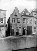 De panden Brede Haven 43 en 42, gezien vanaf de Smalle Haven met daarnaast het straatje Achter de Vergulde Truffel. Het huis nummer 42 was genaamd De Pleijte, later De Gulden Bel. Het werd verwoest tijdens de bevrijding in oktober 1944. Opname in opdracht van Gemeentewerken.