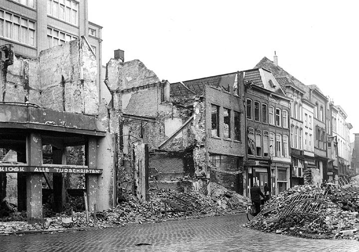 Het was een plein aan de kop van de Haven: de Vismarkt. De doorgang naar de Dommel ontbrak nog en het gedeelte Visstraat dat er was (tussen Hoge Steenweg en Karrenstraat) was smal. Vooral dat laatste is duidelijk te herkennen aan een foto van zo'n zestig jaar geleden. Links, op de hoek met de Smalle Haven bevond zich de kiosk Lectura, waar ondermeer 'alle dagbladen' te koop waren. Daarnaast was de befaamde banketbakkerij van H. van der Zijde. Rechts, op de hoek met de Karrenstraat, stond de Rotterdamse Bank. Het was een oud bankgebouw, dat omstreeks de eeuwwisseling het kantoor was van de bankiersfamilie Van Rijckevorsel. Later kwam dit pand in handen van de Credietvereeniging 'de Hanzebank'. Deze heeft daar echter niet zo lang gebruik van gemaakt, want deze bank ging omstreeks 1930 failliet. Daarna vestigde er zich de Rotterdamse Bank. Naast de bank bevond zich de befaamde zaak in Bossche koek en chocoladebollen: Lambermont, 'de zaak met de antieke koekkist', die uit het eind van de achttiende eeuw dateerde. en daar weer naast, op de hoek met de Karrenstraat was het kinderkledingmgazijn De Einder gevestigd. Recht vooruit, in de Hoge Steenweg ontdekken we enkele panden waarin thans de Bankiers Van Lanschot gevestigd zijn. De bankier bezat er een negentiende eeuws pand en daarnaast was de firma M.L. van Bergen, sanitaire installaties gevestigd. Boven deze panden uit torende het markante silhouet van de Sint-Pieter. En op straat ontdekken we naast voetgangers slechts enkele fietsers. En toen kwam de bevrijding in oktober 1944 dat ook in dit deel van de stad voor grote verwoestingen zorgde. De panden op de voorgrond van de foto werden totaal verwoest. Maar er kwam herbouw. Op de hoek met de Smalle Haven kwamen moderne winkelpanden en ook aan de andere zijde kwam nieuwbouw. Echter de gemeente eiste dat de rooilijn verlegd moest worden: de Visstraat moest breder. Daarom herbouwde de Rotterdamse Bank zijn nieuwe panden enkele meters naar achter, Ernaast vestigde zich Tecklenburg, de vishandel. Deze laatste nieuwbouw met name zorgde ervoor dat de intieme Vismarkt - die al aangetast was door de nieuwe straat richting station - nog meer een open karakter kreeg. En ook op de achtergrond veranderde het een en ander. Van Lanschot had de panden ernaast verworven en deze doen 'restaureren', dat wil zeggen er verschenen moderne panden, gebouwd naar een middeleeuws voorbeeld uit Brugge! Toeristen die er nu foto's van maken en denken met authentieke monumenten te maken te hebben, weten niet dat de panden nog geen vijftig jaar oud zijn! Ook het stadssilhouet boven de bank veranderde. Was dit al aangetast door de nieuwbouw van een flat aan het Burgemeester Loeffplein, door de sloop van de Sint-Pieter in 1982 werd het flink aangetast: het stadsgezicht van 's-Hertogenbosch was opnieuw veranderd. |