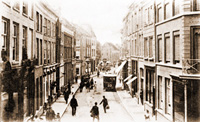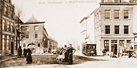 Het lijkt alsof de Visstraat altijd al is aangelegd om de wijk Het Zand en het station te ontsluiten. Maar dat is niet waar. Oorspronkelijk was de Visstraat enkel het kleine stukje straat tussen de Hoge Steenweg en de Kruisstraat. Na dit smalle stukje straat kwam er een plein: De Vismarkt, aan de kop van de Haven. Vervolgens 'botste' men als het ware tegen de huizen aan: de gevelrij van de Brede Haven liep schuin door naar de Lepelstraat. In 1868 bereikte de eerste stoomtrein Den Bosch. En na een eerste station kwam er aan het eind van de eeuw, op de nieuwe wijk Het Zand, het door Eduard Cuypers ontworpen station. Toen woonden er al veel mensen in de nieuwbouwwijk. De eerste bewoner van Het Zand, L. Bogaerts, werd door menig Bosschenaar een vroegtijdige dood voorspeld, omdat hij dagelijks de brug over de Dommel zou moeten passeren, bij weer en wind, bij nacht en ontij. Er werd zelfs geopperd de leuningen van de Dommelbrug van glazen schermen te voorzien, om passanten tegen windvlagen te beschermen. De Vismarkt werd verplaatst naar de Lepelstraat en er werden huizen gesloopt om de verbinding naar Het Zand te realiseren. Enige tijd heeft de nieuwe verbinding bestaan uit de straten Visstraat, Vismarkt en Spoorstraat, maar later heette het geheel: Visstraat. In het begin zal het niet druk geweest zijn. Af en toe reed een koets van of naar het station om passagiers te vervoeren. En karren reden met hun bij het spoor gehaalde lading de binnenstad in. Wandelaars konden zich rustig op de rijweg begeven. Maar al snel veranderde dat. Ondermeer door de komst van de tram. Deze manier van openbaar vervoer raakte snel populair. De eerste stoomtram reed in november 1881 tussen Den Bosch en Vught (vanaf 1895 zou deze tram weer door paarden getrokken worden). In 1883 kwam de tramverbinding met Hintham, Rosmalen en Berlicum tot stand. Op het eind van de 19e eeuw kwam er een verbinding met Vlijmen en Drunen bij (1896) en naar Den Dungen en Sint-Michielsgestel (1899). De bussen verdreven de tram en in maart 1937 deed de laatste tram Den Bosch aan. De huizen op de foto zijn na een eeuw nog te herkennen. Het 17e eeuwse monument 'De Gulden Steur' links aan de Visstraat heette in het begin van de eeuw 'Nieuw Bosch Koffiehuis' en kende bovendien een logement en stalling. Het werd geëxploiteerd door J. van Esch. Het eerste pand aan de Brede Haven is eveneens gehandhaafd. Verdwenen is het pakhuis De Crab (de naam was te lezen op de kroonlijst) op de hoek van de Lepelstraat en de Visstraat. In het begin van de eeuw was het 'een bewaarplaats van wijnen', zoals op de poort geschilderd stond. In oktober 1944 werd het gebouw onherstelbaar beschadigd. Thans staat het kantoorgebouw ABN-AMRO prominent op deze hoek. het bankgebouw werd in 1987 gerealiseerd naar een ontwerp van de architecten Touber (uit Alkmaar) en Van Dillen en Ogier uit Rosmalen. |