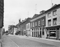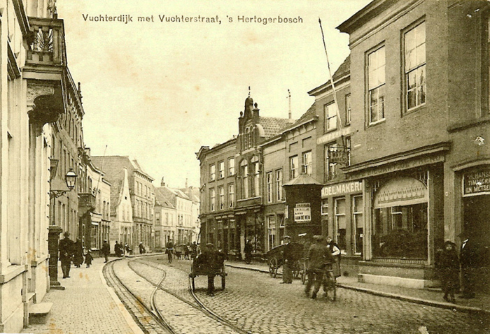 Het was de belangrijkste Bossche straat: door de Vughterstraat kwamen de Brabantse hertogen indien zij hun noordelijke vestingstad wilden bezoeken. Daarom was de Vughterpoort de meest indrukwekkende Bossche stadspoort. En de Vughterstraat, geen rechtlijnige straat, maar met fraai gebogen rooilijnen, leverde na elke tweehonderd meter een nieuw gezichtsveld op. Toch kende de Vughterstraat ook ongewenste bezoekers. In de winter van 1585 werd de stad op een vroege ochtend door Staatse troepen binnengevallen, die eerst via een hinderlaag de poortwachter hadden verschalkt. Enkele honderden soldaten trokken via de Vughterstraat naar de Markt, totdat de wakker geschrokken Bosschenaren ze uit de vestingstad konden verjagen. Tot ver in de twintigste eeuw kende de Vughterstraat weliswaar vele winkels, maar er waren ook tal van woonhuizen in deze hoofdstraat aanwezig. Thans zijn praktisch alle woonhuizen uit het eerste deel van de Vughterstraat verdwenen; incidenteel wordt nog wel boven winkels gewoond. Maar steeds breder wordende winkelpuien verhinderen speciale opgangen om deze bovenwoningen te kunnen bereiken. Kenmerkend voor de Vughterstraat is dat deze altijd een groot verkeersaanbod heeft gekend. Tot in de Tweede Wereldoorlog moest al het Noord-Zuid verkeer dwars door de Bossche binnenstad, door de Vughterstraat. Iedere automobilist uit de richting Tilburg en Eindhoven die naar Nijmegen of Utrecht moest, reed door de straat. Ook de tram maakte gebruik van deze straat. Tot 1929 reed de paardetram in de richting Vught via de in de Vughterstraat liggende rails. In dat jaar werd de tram opgeheven. Tot 1964 kende de Vughterstraat, evenals de meeste Bossche straten, tweerichtingsverkeer. Daarna mocht het verkeer slechts in één richting door de straat rijden. Fietsers mogen dat tegenwoordig van twee zijden. Wat opvalt als we foto's van vóór de Tweede Wereldoorlog vergelijken met de huidige situatie, is dat de reclame boven de winkelpuien enorm is toegenomen. Waren er zestig jaar geleden enkel uithangborden en beschilderde winkelruiten, thans schreeuwen de grote teksten en lichtreclames je tegemoet. Dit jaar heeft de Vughterstraat een 'Spaanse' renovatie ondergaan. De trottoirs en het wegdek zijn geheel vernieuwd. Wat opvalt, is dat de stoepen over het algemeen iets breder geworden zijn. Vóór de renovatie volgden de stoepranden meer de gevelrooilijnen, nu zijn de bochten afgesneden. Maar toch zijn - en dit in tegenstelling tot de Hinthamerstraat - de rooilijnen tamelijk goed gevolgd. De trottoirs zijn ook breder geworden. Met als ongewenst gevolg dat er thans regelmatig auto's 'even' half op de stoep geparkeerd worden. |